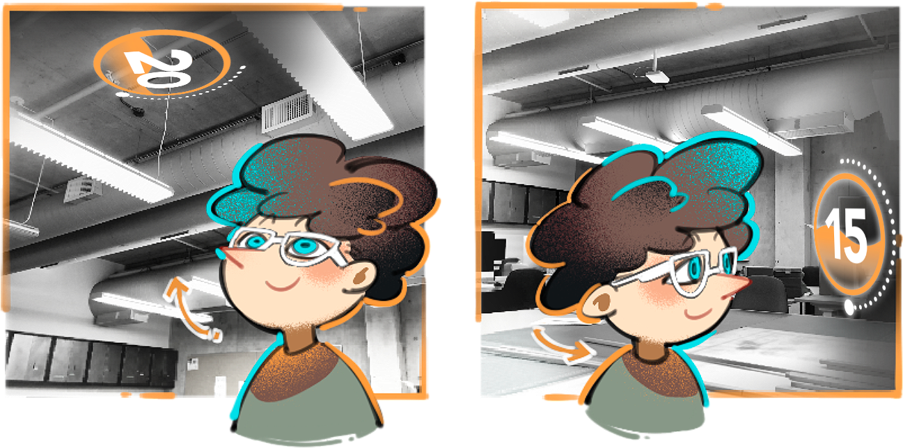 The 20-20-20 rule is a popular exercise for protecting your vision. It involves looking at something 20 feet away for 20 seconds every 20 minutes to give your eye muscles a break from prolonged screen time. To facilitate this exercise, Office Doctor has implemented an AR visual guidance that directs users to look at various distances. A number displayed on the guide counts down once the user's eyes track the visual symbol, which then reappears in different positions, allowing users to rotate their eyeballs and neck.