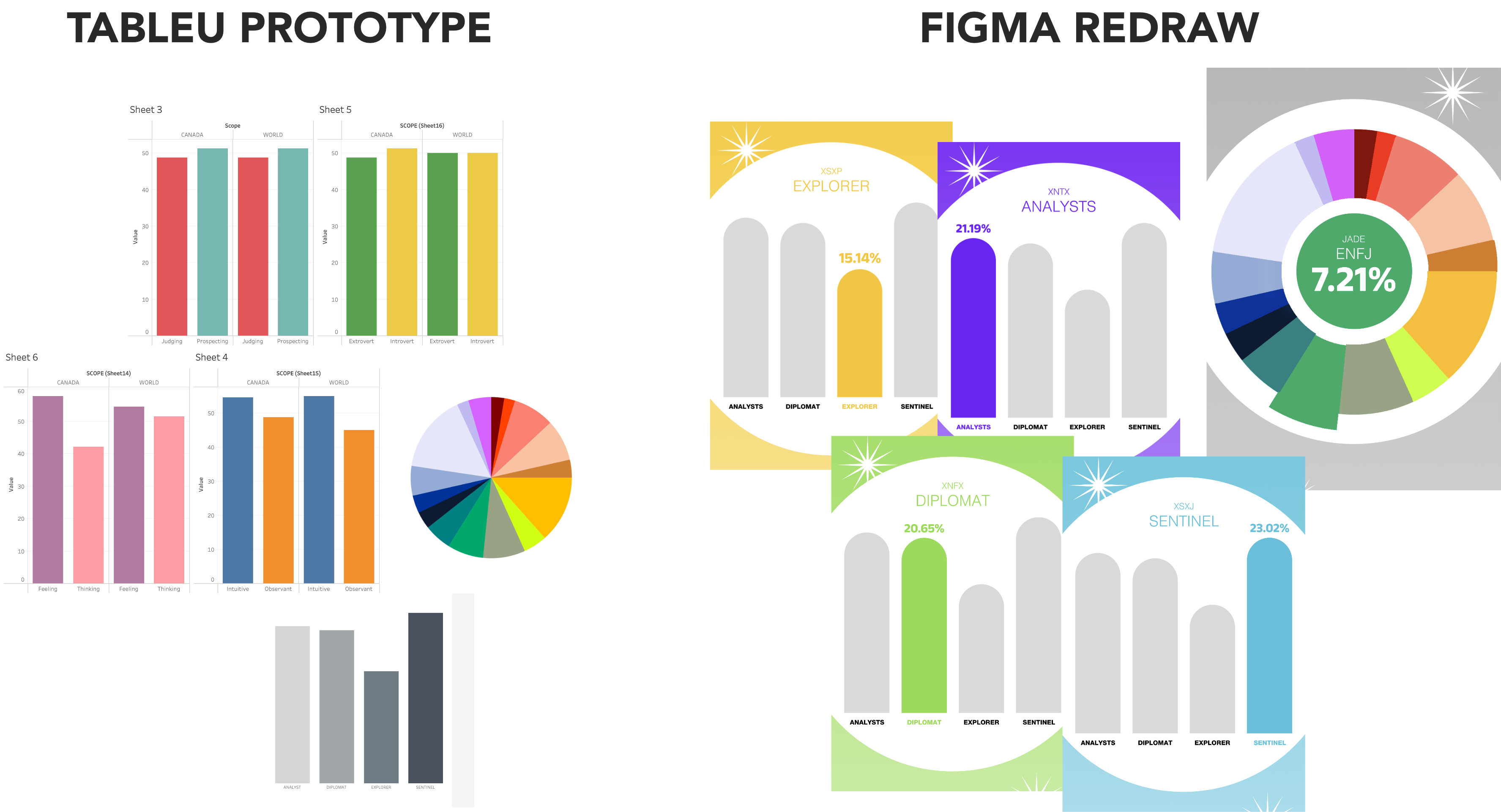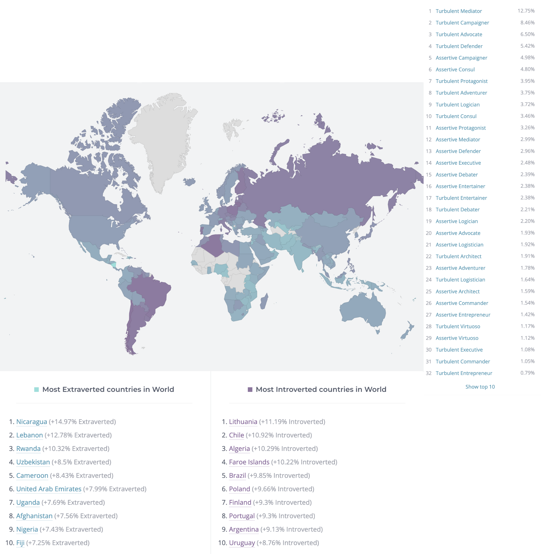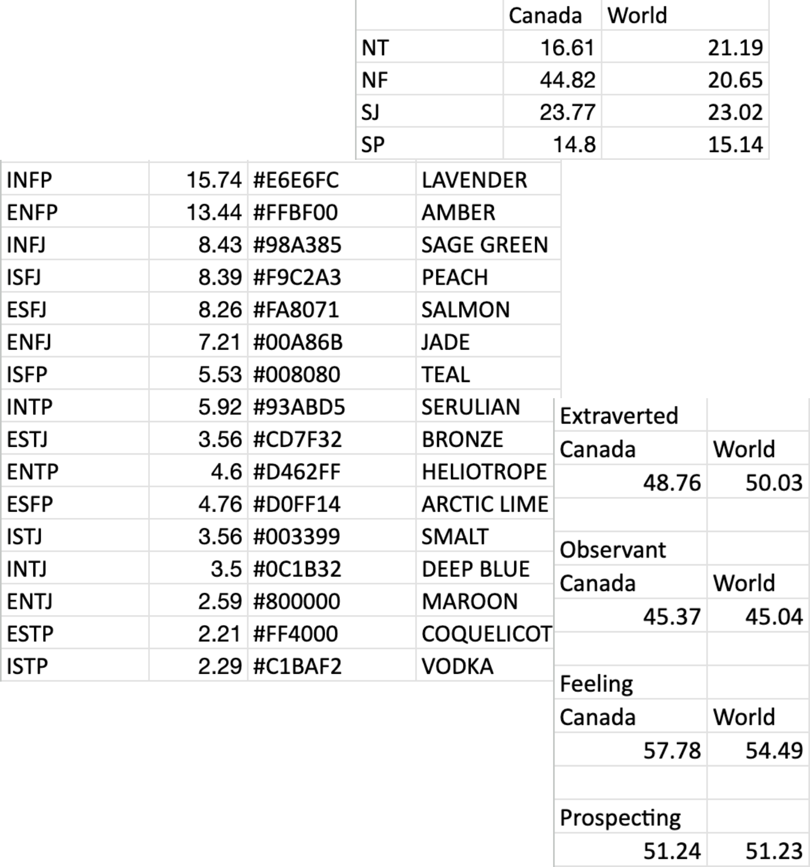 Through my research, I discovered that in Canada, individuals with feeling traits are significantly more prevalent than those with thinking traits, and there are more intuitive, introverted, and prospecting individuals than observant, extroverted, and judging ones. The most common personality types in Canada are the mediator (INFP, 15.74%) and the campaigner (ENFP, 13.44%), with diplomats (people who have intuitive and feeling traits in their personality type) accounting for up to 44.82% of the total population. However, worldwide, sentinels (people who have observant and judging traits in their personality type) have the highest population.