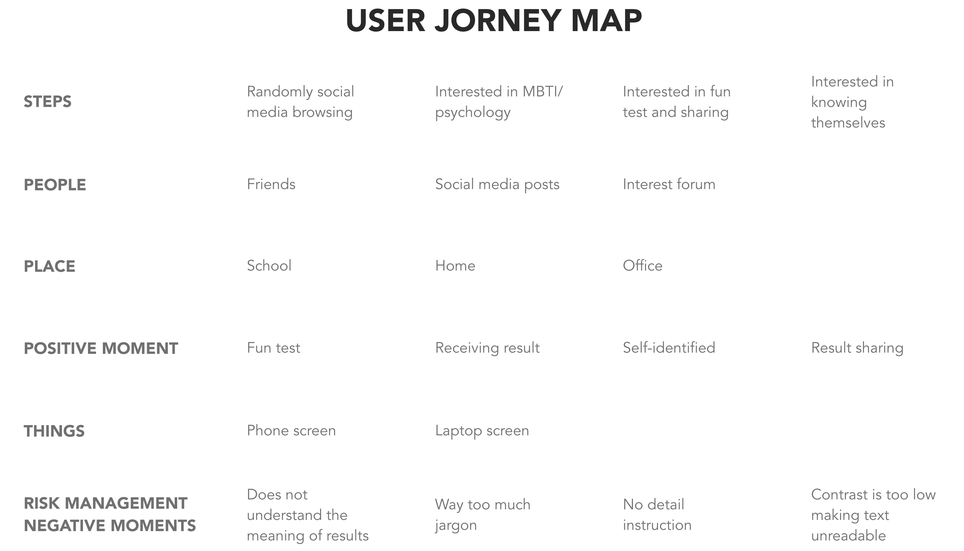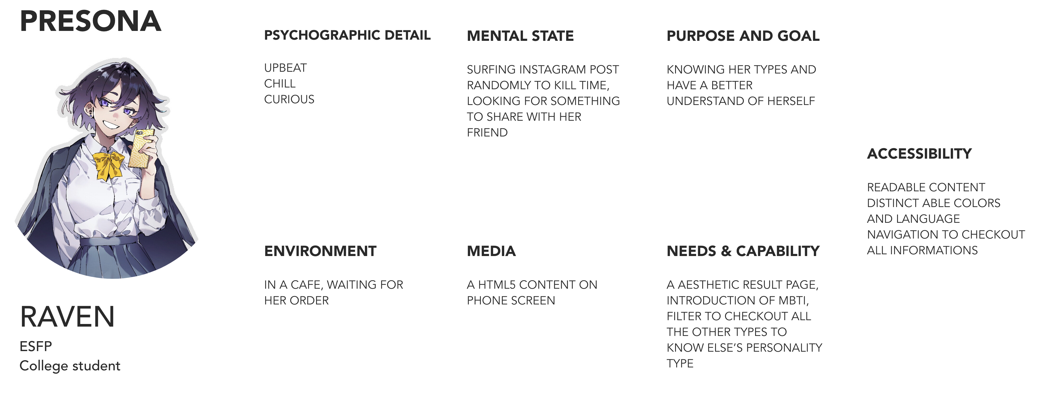 To enhance user engagement, I also developed a short test that categorizes users into each type based on the most significant traits of each function letter, facilitating their connection with the personality types while browsing the database.To improve user accessibility and engagement, I assigned each MBTI personality type with a unique color for visual representation, obtained from internet polls. Furthermore, I utilized visual effects to create a more immersive experience for users, promoting a deeper understanding and impression of each personality type.
